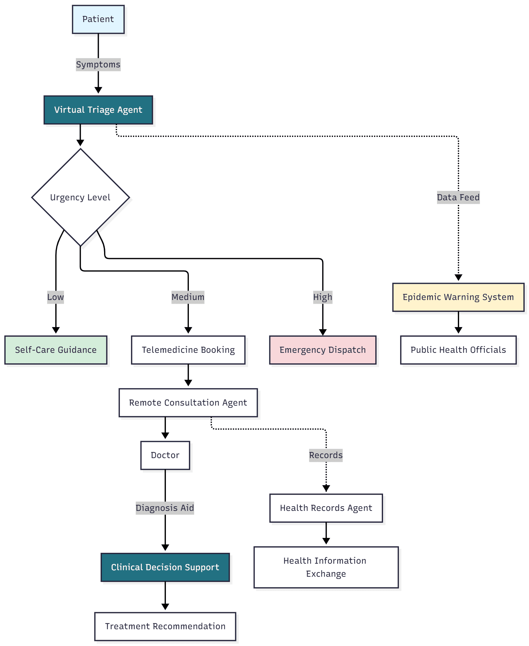Perhaps nowhere is the impact of AI-driven agents more immediately felt than in healthcare service delivery. Health is deeply personal and urgent – a matter of life, death, and quality of life. AI agents in this sector take on roles from virtual health assistants that interface with patients, to behind-the-scenes algorithms that help doctors make better decisions or public health officials detect outbreaks faster. The goal is to enhance efficiency (treat more people, faster), responsiveness (get the right care at the right time), and inclusion (extend services to underserved communities) – all while upholding the fundamental dignity and care that patients deserve. Let’s explore some key use cases: patient triage and diagnosis, health data tracking, and epidemic prediction and response, highlighting real-world examples such as the World Health Organisation’s initiatives, India’s eSanjeevani telemedicine platform, and innovations in places like Rwanda.