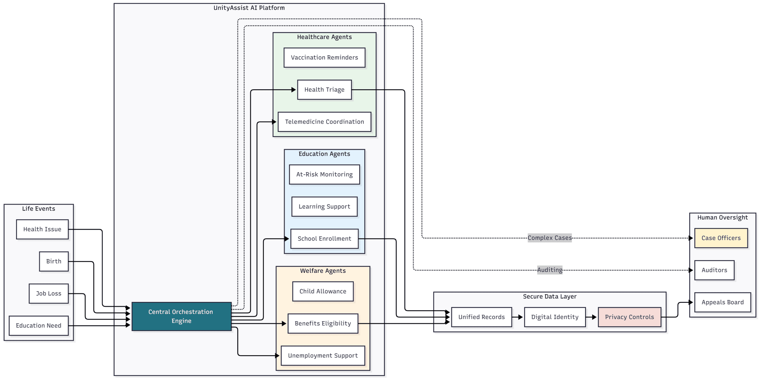 In the background of all this, UnityAssist is not a single monolithic AI, but a coordinated network of specialized AI agents (one focusing on health, one on education, one on welfare, etc.) that communicate with each other through a common platform. This network is governed by strict data privacy and ethics rules. For example, when the education AI flags Sofia’s reading issue, it does not share her personal data with third parties and it only does so because the parents opted into academic support services. All decisions that impact benefits or rights (like approving the unemployment claim or assigning a school) are transparent: UnityAssist provides explanations if asked, like “We approved your ChildCare Allowance because your household income (which is \$Y) falls below the threshold \$Z for a family of your size[44].” If any decision were adverse (say if Jose’s unemployment claim was denied), the system would automatically escalate it for a human review and provide Jose with information on how to appeal, ensuring no one is left confused by a machine’s rejection.