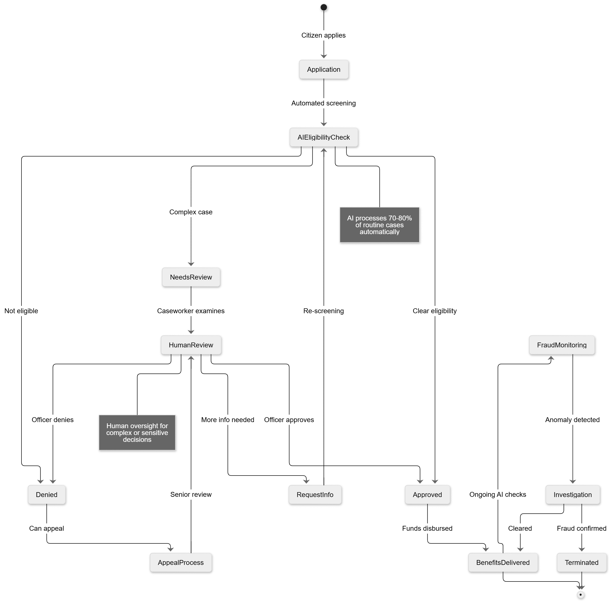 Automating Eligibility and Case Processing: Determining if someone is eligible for a welfare benefit can involve dozens of parameters and rules. Traditionally, a caseworker gathers applicant information, checks it against databases (income records, family size, disability status, etc.), and applies legal criteria. This process can be slow – leading to backlogs where applicants wait months for an answer – and sometimes inconsistent, as human judgment can vary. AI systems can encode the complex rules and rapidly cross-check multiple databases, giving near-instant decisions for straightforward cases. The Baltic nation of Estonia provides a shining example of embracing AI for efficient and citizen-friendly welfare services. Estonia has woven AI throughout its digital government, aiming to offer seamless and even proactive services. In fact, the Estonian government’s vision is to create “invisible” e-services that anticipate needs based on life events[40]. In practical terms, when an Estonian loses their job, the system can automatically detect that event (through employment records) and proactively offer unemployment benefits or retraining programs without the person even having to apply[40]. This is implemented via the Unemployment Insurance Fund’s AI-driven system which not only matches job seekers to open jobs (based on their skills and experience) but also predicts who is at risk of long-term unemployment[41]. Those predictions allow the government to channel more counselling and training resources to those individuals early on. The approach is citizen-centric: instead of making a laid-off worker navigate complex bureaucracy during a stressful time, the state – through AI agents – comes to the citizen with solutions, almost like a concerned social worker doing a house call. Furthermore, Estonia’s use of a national digital ID and interoperable data (via its famous X-Road system) means the AI can pull together all relevant information (with consent and legal safeguards) so that people don’t have to submit stacks of documents. The result is faster service delivery that “just works” and is almost unseen. By 2019, Estonia was already launching several seamless services around life events (like the birth of a child or starting a business), linking dozens of government services together via AI so that citizens get a one-stop experience[40]. For example, upon a child’s birth, the system can automatically draft the birth registration, initiate health insurance for the baby, calculate the family’s new benefits, and even put the child on a waitlist for day-care – all the parents might have to do is confirm with one click[40]. This kind of proactive welfare state is a paradigm shift enabled by AI agents working across departmental silos to focus on the person, not the agency boundaries.